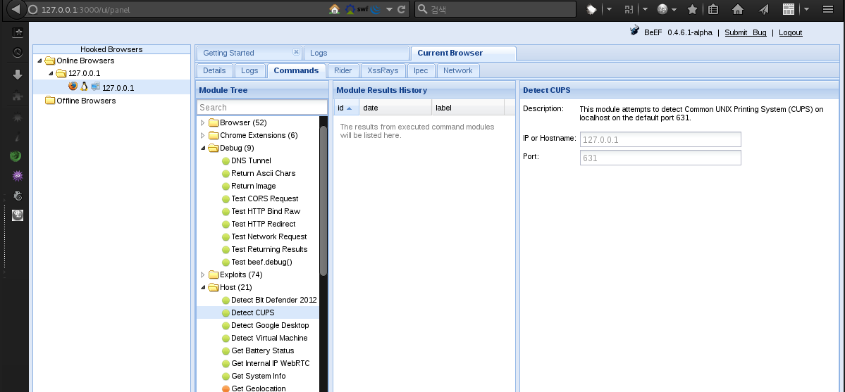 BeEF를 통해 다른 브라우저를 제어할 수 있습니다.
