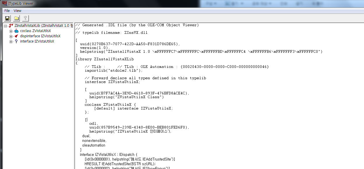 설치 후 Program files (x86)/Windows Resource Kits/Tools/oleview.exe 로 실행 가능하며 각 툴 내 리스트에서 우클릭 후 View Type Information 을 통해 확인할 수 있습니다.