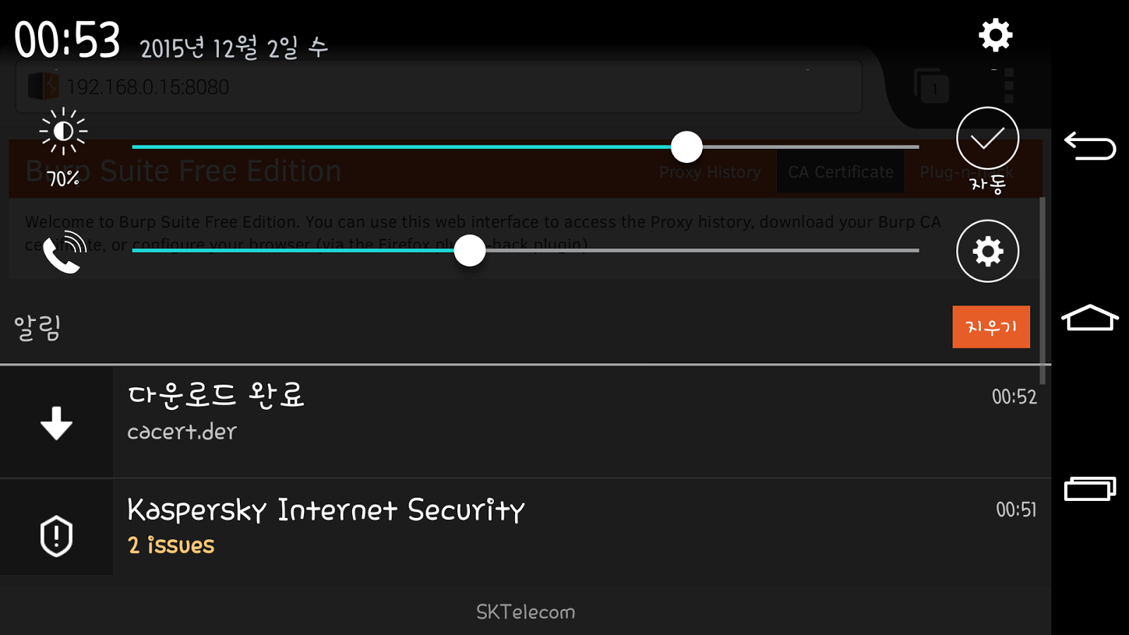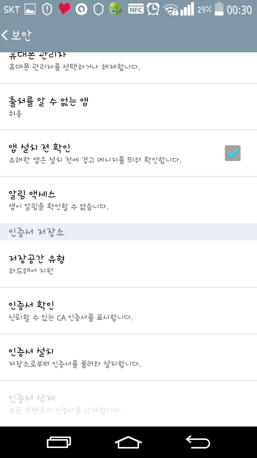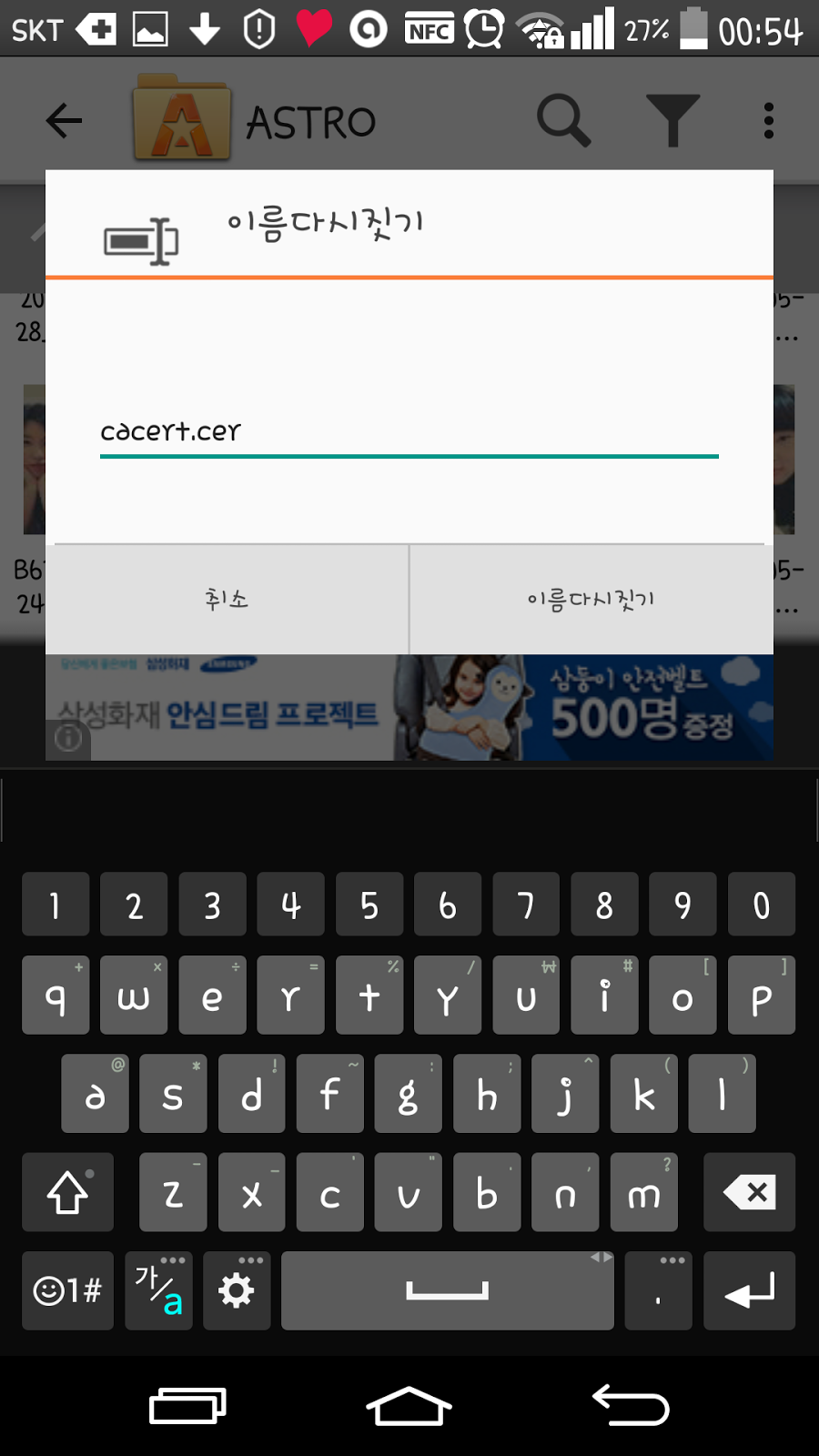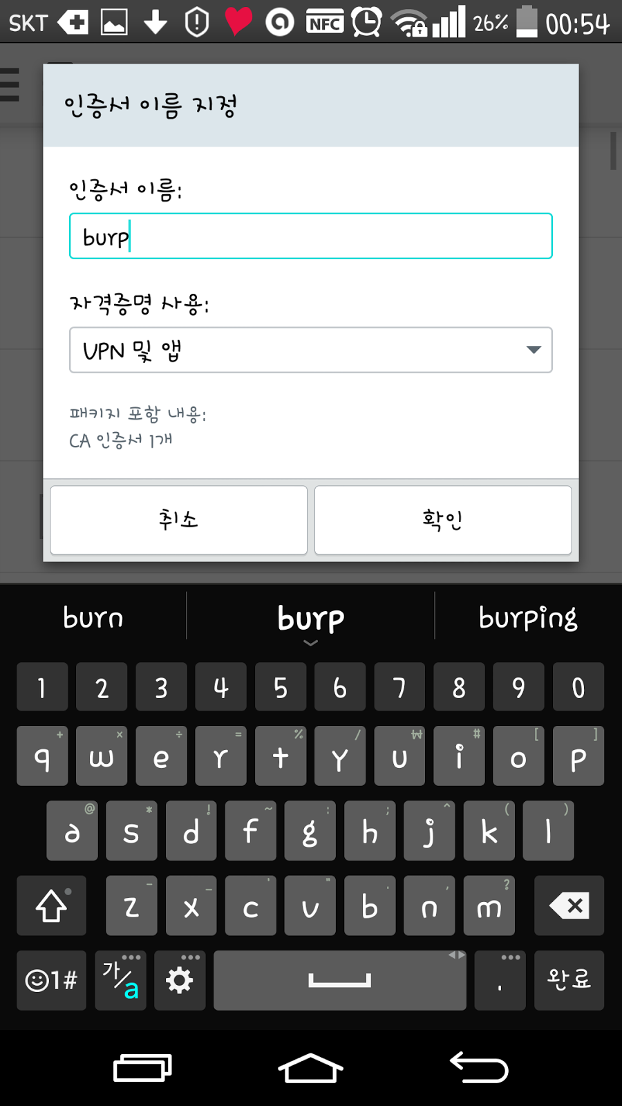 테스트에서는 PC웹을 통해 다운로드 후 ADB or 파일 관리자를 통해 안드로이드 기기에 인증서를 설치하였습니다. 앱에서 직접 접근해서 받은 후 설치하셔도 됩니다.