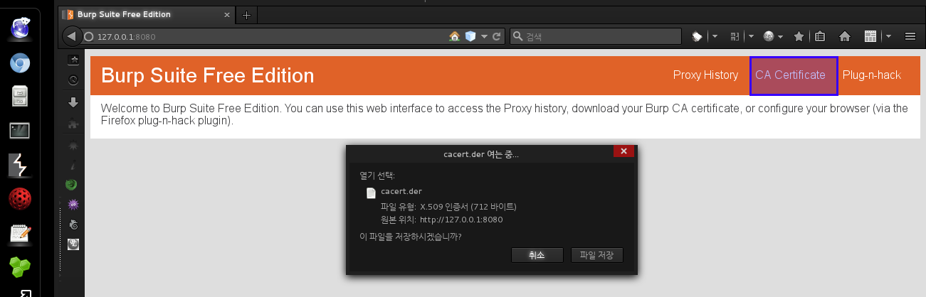 PC나 Android Device에서 burp 페이지(burp 서버 페이지 / ex: 127.0.0.1:8080) 접근 후 우측 상단의 "CA Certificate" 메뉴를 클릭하여 인증서를 다운로드 받습니다.