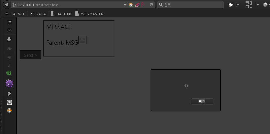 test.html을 열어서 send를 눌러보시면 메시지가 전송되는 걸 볼 수 있습니다. 만약 우리가 이 MSG에 대해 제어가 가능하다면 이런식으로 공격이 들어갈 수 있겠죠.