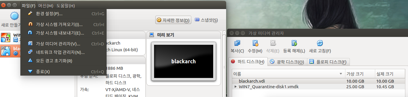 고정할당에서 동적할당으로 바로 변경은 불가능합니다. 약간 편법을 통해 해결이 가능한데요. 먼저 파일 > 가상미디어 관리자 로 들어가 기존 고정할당된 vdi 파일을 복사해줍니다.