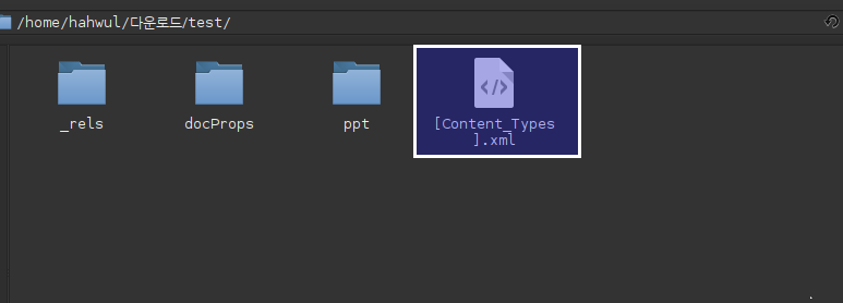 그럼 아래와 같이 [Content_Type].xml 과 ppt 폴더 내부에서 presentation.xml 파일을 찾을 수 있습니다. (다른 문서는 위에 설명한 것과 같이 presentation.xml 이 아닌 다른 파일이에요)