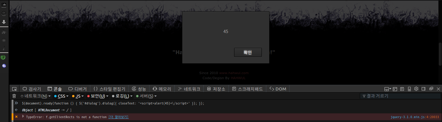 위와 같이 dialog 함수 내 closeText를 지정할 수 있는데, 이 구간에서 특수문자가 필터링되지 않아 고스란히 XSS 구문이 발동되게 되죠. 우리가 Reflected던, Stored던 closeText를 제어할 수 있는 부분이 생긴다면 XSS가 가능하단 소리입니다.