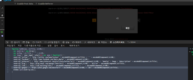 다만 맹점은 있습니다. 위의 경우는 함수안에 들어가기 때문에 결국은 toSNS 함수가 실행되어야 동작할꺼고, 두번째는 태그로 script 를 나가서 동작했기 때문에 문제없이 작동하지만 XSS 대응책 중 가장 우선으로 이야기되는 < > 를 사용하기 때문에 때에 따라 재현이 어려울 수 있습니다.