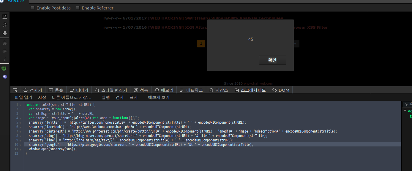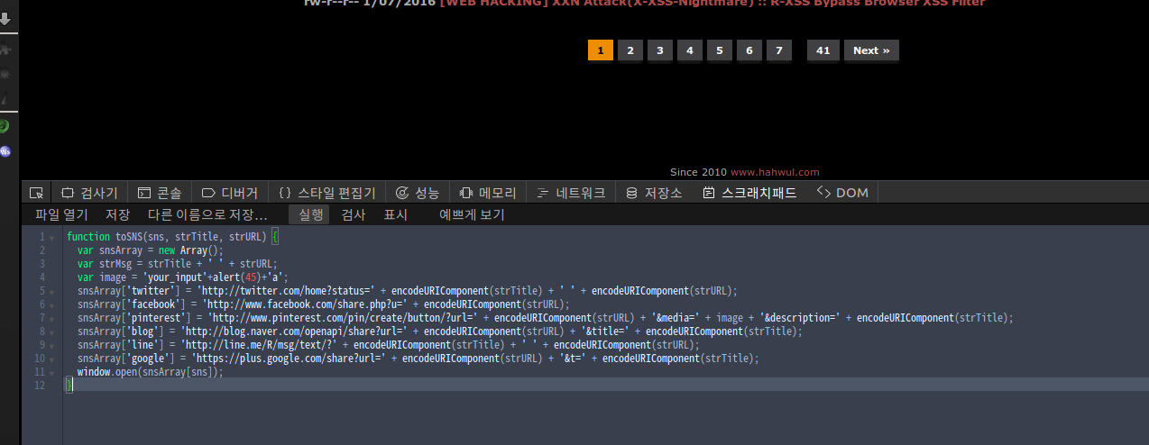 다만 맹점은 있습니다. 위의 경우는 함수안에 들어가기 때문에 결국은 toSNS 함수가 실행되어야 동작할꺼고, 두번째는 태그로 script 를 나가서 동작했기 때문에 문제없이 작동하지만 XSS 대응책 중 가장 우선으로 이야기되는 < > 를 사용하기 때문에 때에 따라 재현이 어려울 수 있습니다.