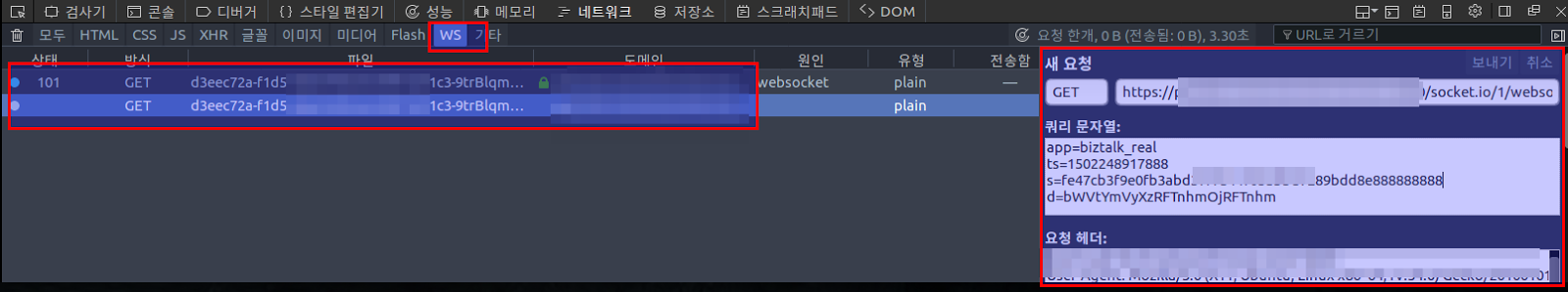 Firefox의 네트워크 탭에는 통신하는 여러가지 데이터들에 대해 로깅하고 보고 수정할 수 있는데, 이 항목에는 WS도 포함됩니다. 우리는 Firefox를 통해서도 WS에 대해 보고 제어할 수 있다는 거죠.