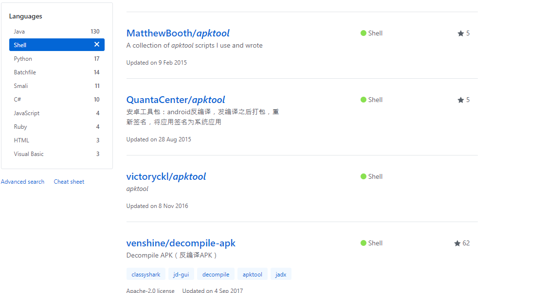java 코드는 대체로 apktool 자체를 fork 한 경우이기 때문에 제외하고 보면.. 대략 100개 정도 될듯합니다. (shell 44 개입니다)