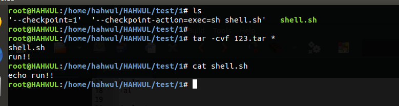 root@HAHWUL:/home/hahwul/HAHWUL/test/1# tar -cvf 123.tar *