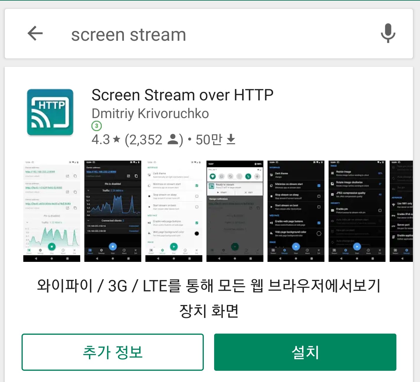 우선 마켓에서 Screen Stream over HTTP 앱을 설치해줍니다. 이 앱은 http로 웹 방송 송출을 해주는 앱입니다.