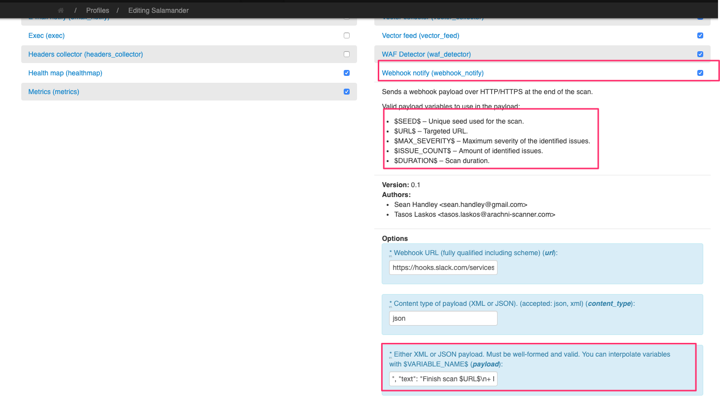스캔이 완료됬을 떄 노티를 받을 수 있으면 참 좋은데, Arachni에서는 플러그인으로 Email 과 Webhook 2개를 지원해줍니다. Webhook이 있다면.. 이미 모든 서비스는 연동할 수 있는 상태이지요. arachni can receive results when scanning is complete through email and webbook plug-ins.