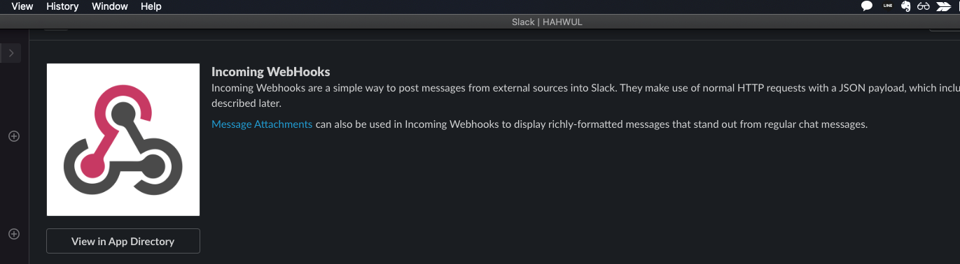 Slack에 들어가셔서 incoming webhook을 적용해줍니다. Slack 무료 플랜이 10개까지인가 쓸 수 있는데, 확장성을 고려하면 incoming, outgoing webhook 2개는 무조건 필수로 생각됩니다. First, Go to the Slack and apply incoming webhook.