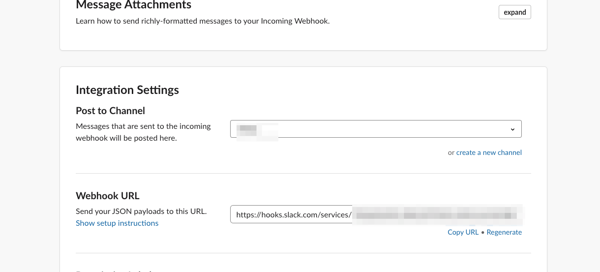 생성 이후 Web Hook URL 복사해둡니다. (미리 쓰고 계셨다면 기존 URL을..)