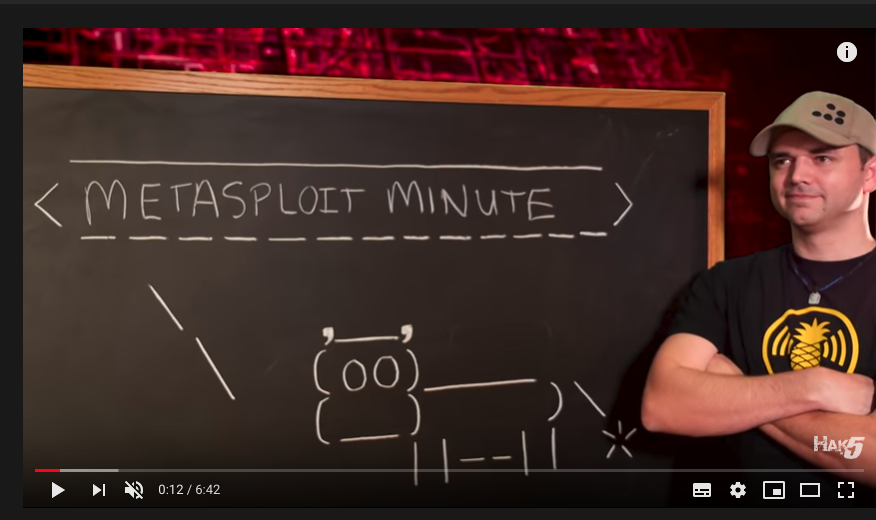 두번째는 Hak5에서 운영하는 컨텐츠 중 metasploit-minute입니다. (전반적으로 hak5 즐겨보고 있고, 따로 유투브 준비하려는 것도 hak5측 많이 참고하려고 해요) 아무튼 metaspliot-minute은 Metasploit을 활용하는 방법들에 대한 영상 컨텐츠이고, 되게 unleashed에 없는 부분들도 많이 하기 떄문에 종종 보시기에 굉장히 좋은 컨텐츠라고 생각이 듭니다.