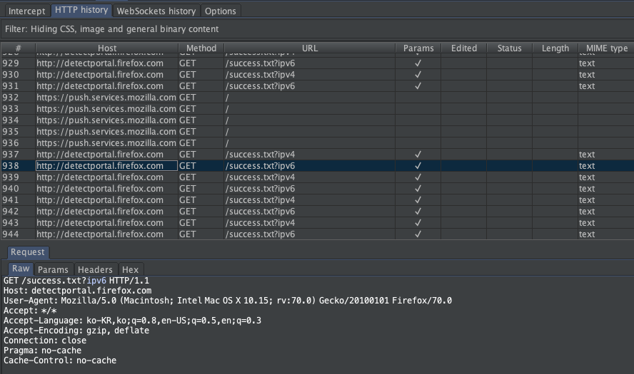 This is a request from Firefox to find the Network Login page. (some.. private network, cafe wifi with authentication) 바로 이런 요청인데, 이 기능은 firefox에서 폐쇄망일 경우 네트워크 로그인 페이지(예를들면, 스벅 Wifi에서 로그인 페이지 등)을 찾기 위해 발생하는 요청입니다. 이 요청이 굉장히 짧은 주기로 무제한 호출되기 떄문에 Burp suite에는 이런.. 만행이 일어납니다.