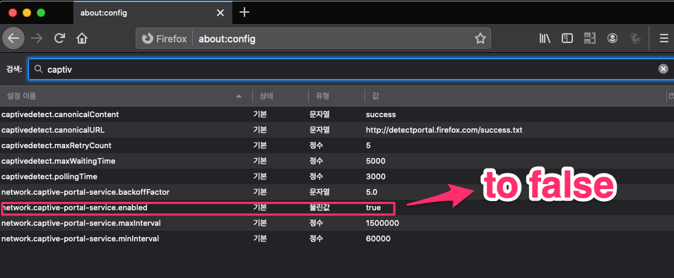 3) network.captive-portal-service.enabled 를 false로 수정(true to false)