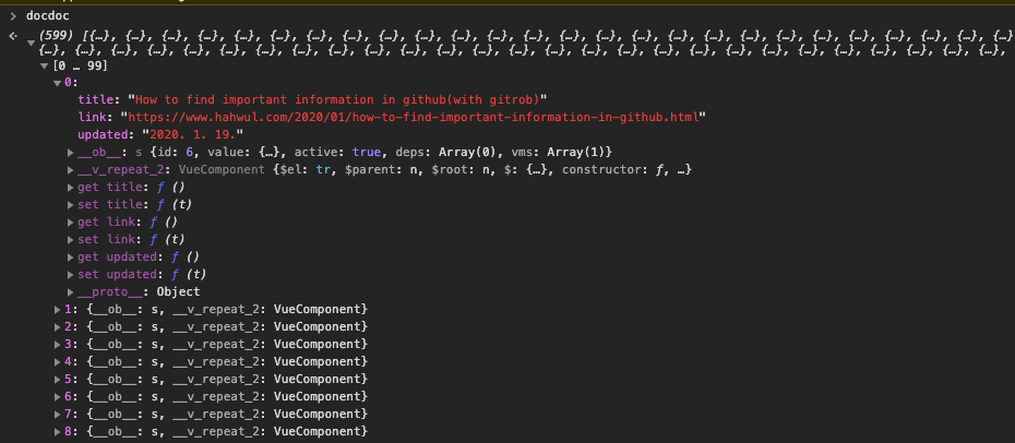 여기서부턴 제 Archive 페이지와 구성이 조금 달라집니다. (전 VueJS를 사용한 상태라..) 위에서 docdoc이라는 Array를 만들고 Hash로 값을 넣어줬기 때문에 forEach로 뺴면 간단합니다.