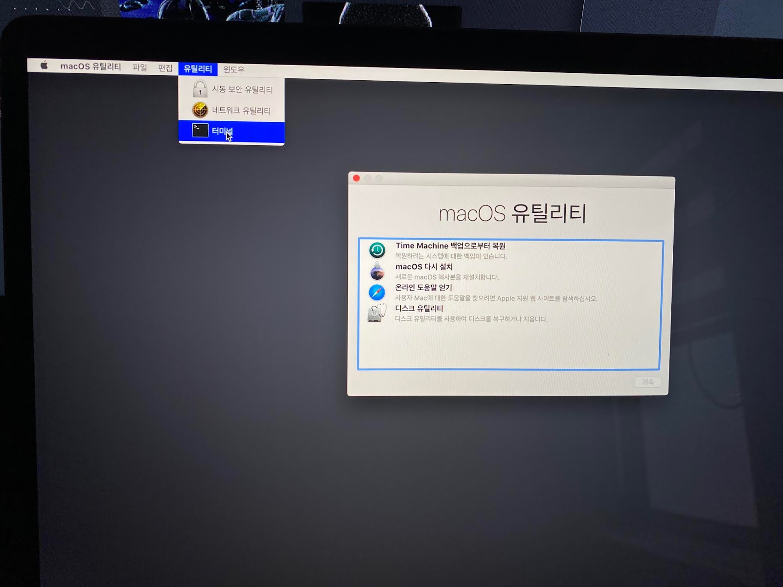 부팅 시 cmd+R 을 꾹 눌러주어 복구모드 진입 > 우측 상단 유틸리티 눌러서 터미널 열어줍니다.