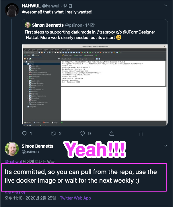 트위터를 보던 중 사이먼의 어마어마한 트윗을 보게되었습니다. 바로 ZAP의 Dark 모드 지원에 대한 이야기였는데요. 가볍게 리트윗했더니 이미 commit 된 내용이고 바로 사용해 볼 수 있다고 합니다. 그래서 아직 Weekly 버전에도 반영되지 않았지만, 미리 체험해보기로 하겠습니다.